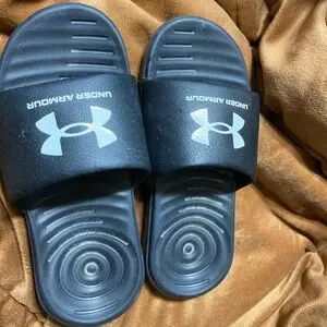 Comfortable black slide sandals. Features Under Armour logo. Easy slip-on design.