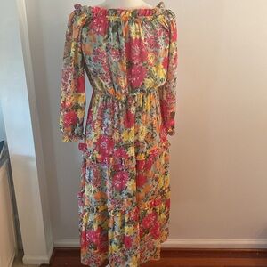 Floral medium off shoulder lined dress by LC Lauren Conrad. Elastic waistband. 44 inches long and waist stretches from 14 to 16 inches lying flat 18 inches pit to pit lying flat. No flaws