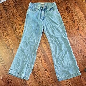 Chic wide-leg jeans with a flattering flare. Light blue wash for versatile styling. Ideal for casual wear.