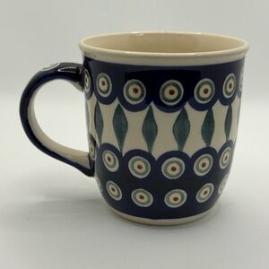 Enjoy your favorite beverage in this stylish ceramic mug featuring a blue and cream pattern. Perfect for adding a touch of elegance to your dining experience. Bunzlau keramik Boleslawiec Polish Pottery peacock pattern ceramic mug