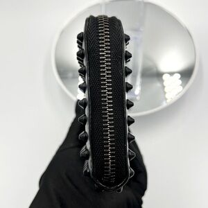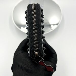 Classic black wallet with iconic red interior. Minor signs of use : one of the spikes have some rubbing and minor coin residue. Otherwise, no callouts.