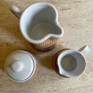 Stamped with geometric shapes and white glaze.It's unmarked but looks similar to mid-century Italian pieces. Features a milk pitcher and spouted creamer both with a handle each and a sugar container with lid. The inside of each piece as well as the handles and lid have a nice thick white glaze as well as the inside of the stamped pattern. The body of each piece have been left in their natural clay form.