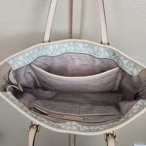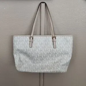 This Michael Kors tote bag in a sophisticated cream color offers a spacious interior and a structured design for easy access. Its elegant style and practical features make it an ideal choice for both everyday use and special occasions.