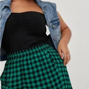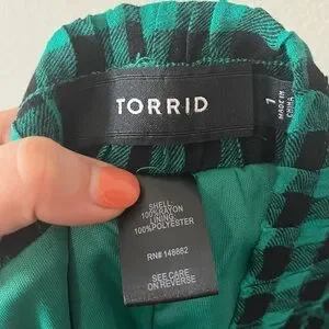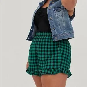 Brand new with tags Torrid Gingham 5-Inch Gauze High-Rise Short in green and black. Plus size 1 = 1X. Pull-on. Elastic waistband. Lined. Rayon/polyester. Retailed for $45.50. NWT- there is writing on interior tag.