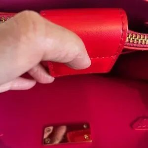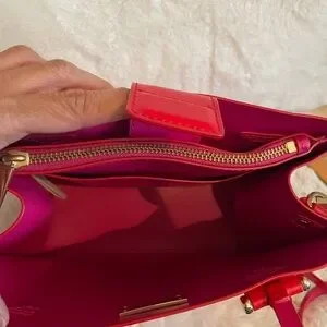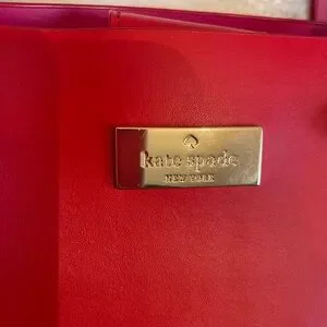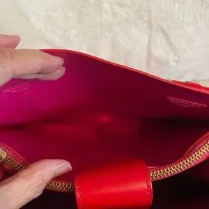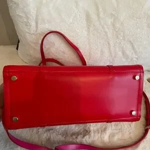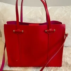 Chic and bold red leather tote from Kate Spade. Pink lining with magnetic closure and zippered section. Features double handles and a removable adjustable crossbody strap. Has 2 small white scuff marks as shown in photos.