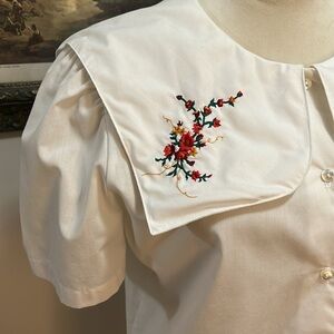 Vintage White Blouse with Floral Embroidery Oversized Collar Sailot Collar