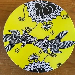Fish Koi Japan Anthro Anthropologie quality. Bright yellow black statement colorful swim entertain serve plate platter nonbreakable durable hostess host pool party boho bohemian fun