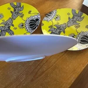 3 large Anthropologie melanine koi fish platters/plates. 12 inch. Beautiful condition! Perfect in the summertime or for serving cakes, cookies, salads. Could also be used as decor! One had a name written on the bottom- barely perceptible.