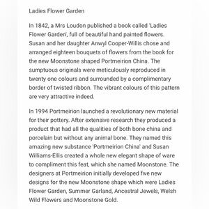 This wonderful two-handled soup bowl, and stand is from the beautiful Ladies Flower Garden range of China from Portmeirion, and features Homeric collina as the design.