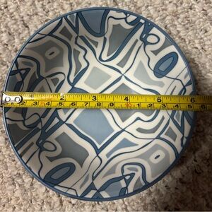 Set of ceramic bowls with a blue exterior and abstract patterned interior. Perfect for serving or decor. Can be put in Dishwasher, Microwave, and Oven up to 280 degree C