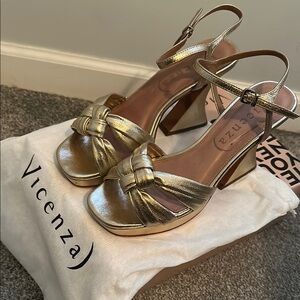 These gold heels feature a chic strappy design with a stable block heel, perfect for adding a touch of glamour to any formal occasion. The metallic finish enhances their luxurious appeal, making them a standout choice for elegant events. Leather sole. Made in Brazil.