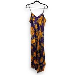 Vintage 90’s Y2K Purple Yellow Floral Satin Slip Dress w/ Chiffon Flutter Hem