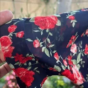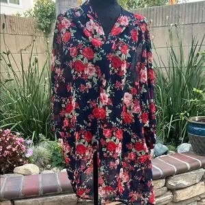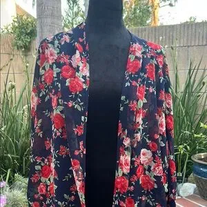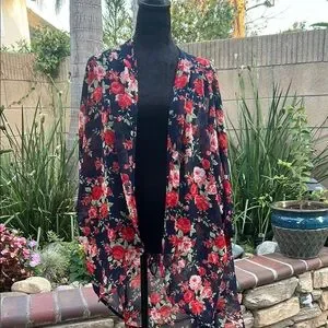 Elevate your style with this elegant floral sheer kimono jacket. Featuring a vibrant red floral pattern on a classic black background, this piece adds a touch of sophistication to any outfit. Perfect for layering, it offers a chic and versatile look.