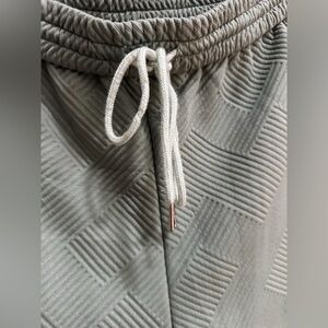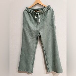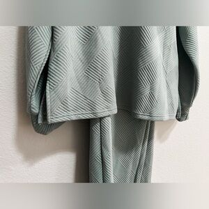 Stylish green lounge set with a textured pattern. Comfortable and chic for casual wear. V neck top with collar. Wide leg pant with drawstring and pockets.