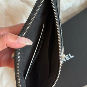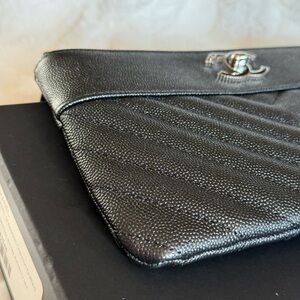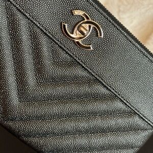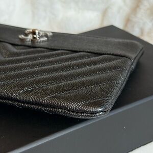 Chanel Black Chevron Mademoiselle O Pouch with Sivertone hardware, Black Caviar Leather, Interlocking CC, Zip top closure, 3 interior credit card slots, Single Interior Pocket, Canvas Interior lining