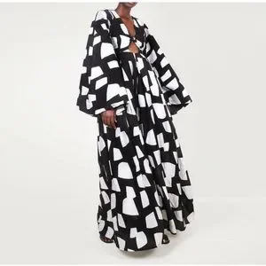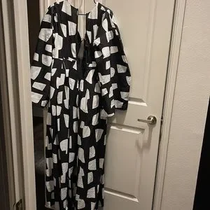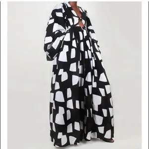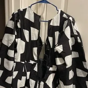 Stylish black and white geometric jumpsuit with a modern design. Perfect for any occasion.