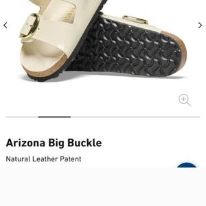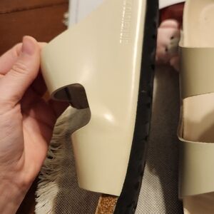Good used condition birkenstock big buckle sandals in high shine ecru. The size size is a 38 in birkenstock is a 7 -7.5. Gold accents in buckles. No box. Some marks on the inside of shoe from cleaning. A little creasing from wear. There is a small mark on the 1 shoe pictured.