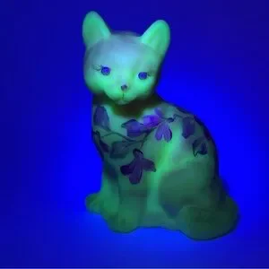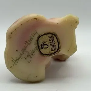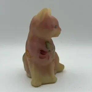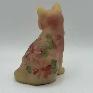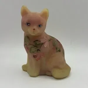 The Fenton Burmese Sitting Cat Figurine is a beautifully hand-painted piece featuring floral pink hues with rosy and blue eyes. Made from uranium glass in the United States, this limited edition figurine is signed by the renowned brand Fenton. With its decorative art glass production style and matte finish, this collectible item exudes elegance and charm, making it a perfect addition to any cat lover's collection. Standing at 3.5 inches tall, this figurine embodies grace and sophistication with its intricate design and unique features.