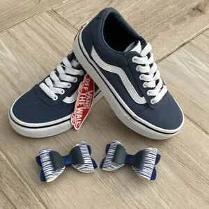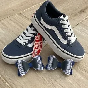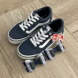 Vans Ward sneakers feature durable canvas upper in a timeless blue with iconic white leather 'Jazz stripe' . Classic waffle outsole add to their appeal, and while similar to the classic old Skool , wards come with a wider padded collar and reinforced toe cap to ensure comfort and durability.
