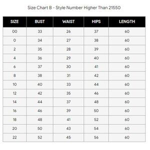 Sizing tips: Every designer cuts their dresses differently & according to their size chart. Please measure yourself (in inches) before ordering & follow our size chart (pictured under the main dress picture). If you are in between sizes or unsure of the fit, choose a size up, as it is easier for your seamstress to take in rather than out. Please refer to the size chart in our images section.
