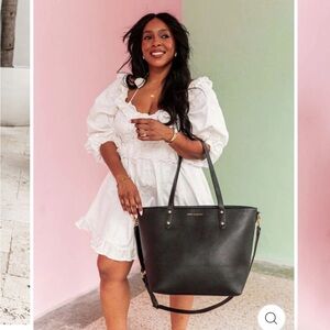 Experience the sophistication of the Poppy & Peonies Black Tote, crafted from smooth leather with a structured rectangular shape. Its minimalist design and professional silhouette make it a versatile choice for any occasion, seamlessly complementing a variety of outfits.