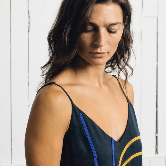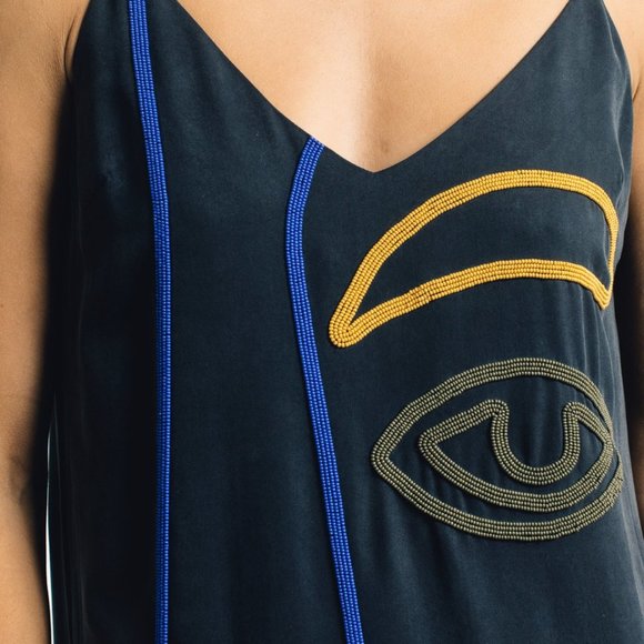 A sleeveless sheath dress in a mid-length that features adjustable straps and a deep v at the front and mirrored on the back. Overall body has a relaxed fit, straight through the hips and loose throughout. Beaded modern face motif on top of a soft black modal fabric. Fully lined.