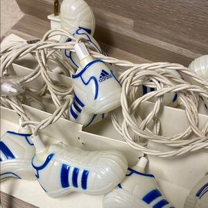 Adidas string lights shaped like shoes. Features white and blue design. Adds a sporty vibe to any room. Man cave shoe store vintage adidas lights