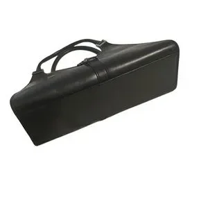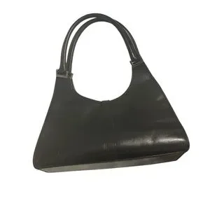 Chic black leather design. Features sleek silver hardware. Perfect for any occasion.