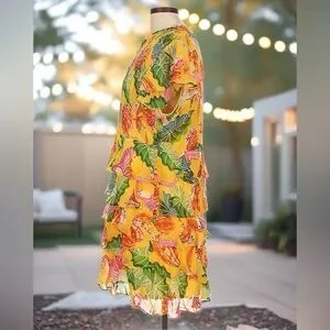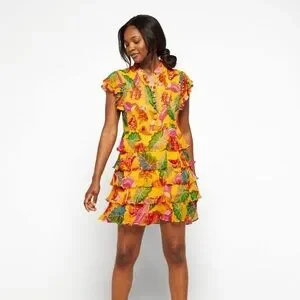Brighten your wardrobe with this vibrant floral ruffle dress. Featuring a stunning yellow base with pink and green accents, this dress is perfect for any occasion.