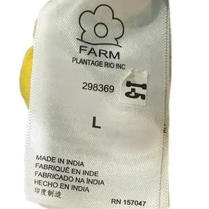 Practically new: shows no obvious signs of being worn or washed. 100% viscose. Short sleeve, ruffles, tropical print, ruffle accents, yellow, short
