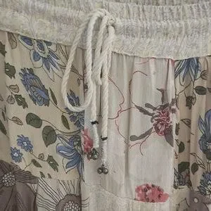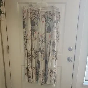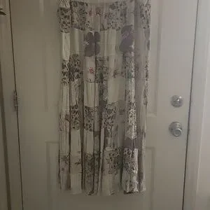 Embrace bohemian style with this floral patchwork maxi skirt. One size. Elastic waist band with draw string. Great for Renaissance festivals. Skirt is 40" long. Small stain at waist band.