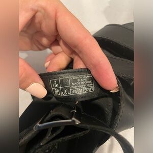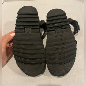 Stylish black sandals with a chunky sole. Features adjustable strap and signature yellow stitching.