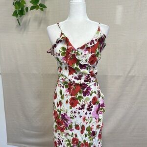 Elegant floral maxi dress. Features vibrant red and green floral pattern. Perfect for any occasion.