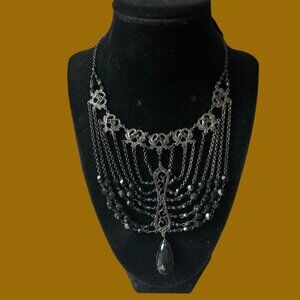 The design incorporates clustered bead patterns, chains, and a prominent central pendant, likely made of glass or a similar material.