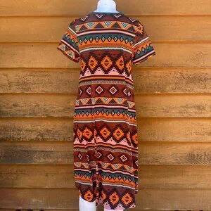 This Aztec-inspired midi dress combines vibrant multicolor patterns with a soft stretch fabric for a polished, yet comfortable look. Its short sleeves and flowing design offer ease of movement, making it suitable for professional or casual settings.