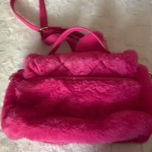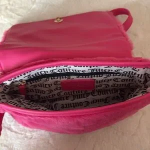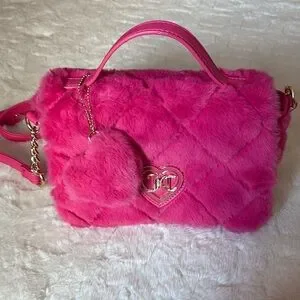 This Juicy Couture crossbody bag in a vibrant pink hue features a luxurious quilted design, offering both style and functionality. The plush texture and chain strap detail add a touch of elegance, making it a perfect accessory for any occasion. Its compact size and chic design make it an ideal choice for those on the go.