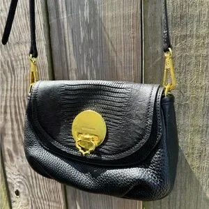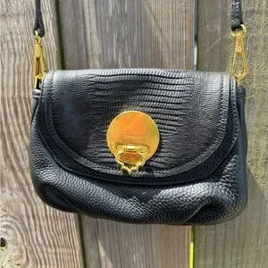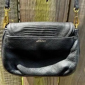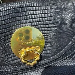 This OrYany crossbody bag features a sophisticated black and gold color scheme, highlighted by a pebble/alligator-like genuine, buttery leather. The bag's sleek silhouette and gold metal accent add a touch of elegance, making it a versatile accessory for any occasion.
