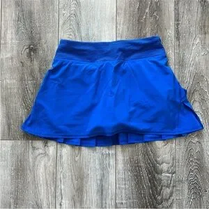 This athletic mini skirt from Lululemon Athletica features a vibrant blue color and a pleated skater style, perfect for dynamic movement. Designed for athletic occasions, its lightweight fabric and flared silhouette ensure comfort and flexibility during activities.