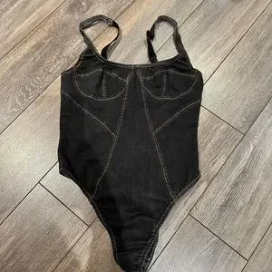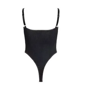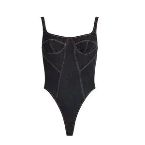 Stylish black denim bodysuit. Features structured design. Perfect for layering.