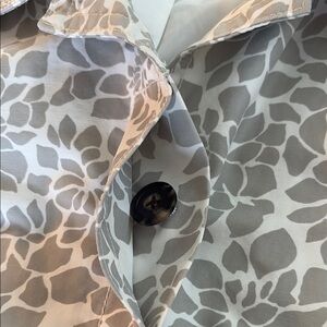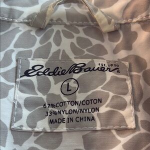 Discover the elegance of this Eddie Bauer trench coat, featuring a sophisticated gray and white color palette. Designed with a tailored silhouette, this coat offers a timeless style perfect for any occasion. Totally waterproof! Two front pockets.