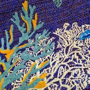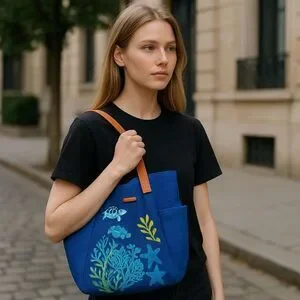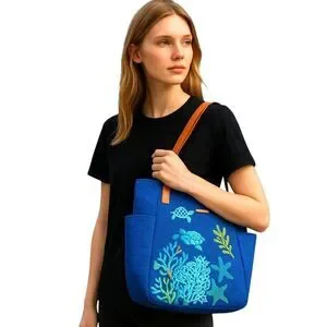 Vivid Blue Straw tote featuring embroidered turtles amongst sea plant life.