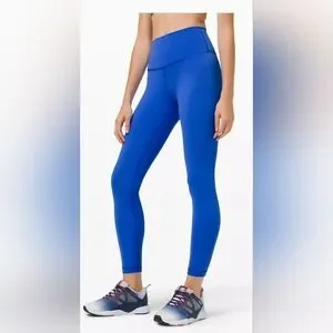 Stylish blue high-waisted leggings. Perfect for workouts or casual wear.
