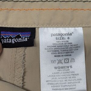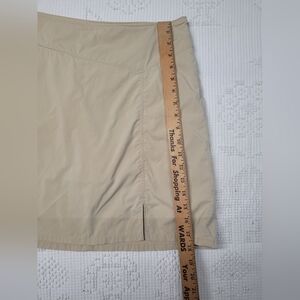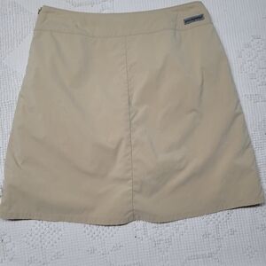 Patagonia womens tan skirt/shorts combo, size 8. One zipper pocket, and a side zipper. There is one spot of discoloration underneath the pocket (see photos). Otherwise in good pre-owned condition.