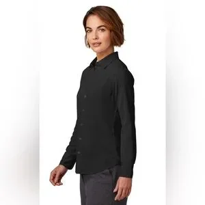 This sleek black button-down shirt from Brooks Brothers features a fitted design with a classic dress shirt collar. Crafted with long sleeves, it offers a polished and timeless look suitable for any occasion.