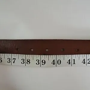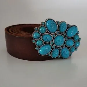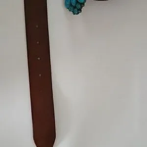 belt holes are at approx 37.5" and 41.5". xl brown leather belt with turquoise and silver buckle. great pre-owned condition. view all pics for detail.