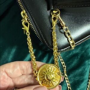 There is a long chain that attaches to top handle, a short medallion that connects zipper to handle. These are both removable. I’ve posted a few more photos - thanks for asking 🌸
