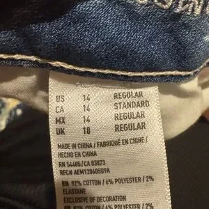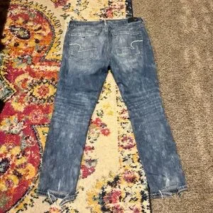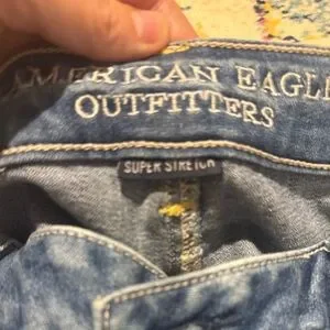 These American Eagle Outfitters skinny jeans feature a stylish distressed design with a classic blue color. The heavily worn-in appearance, complete with rips and tears, offers a trendy and comfortable fit. Perfect for a casual, laid-back look.