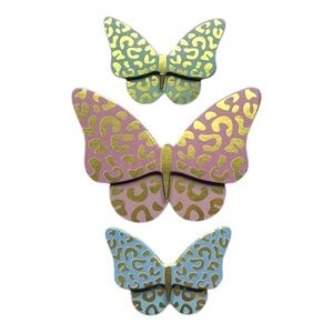 Set of three butterfly cheetah print magnets in gold and pastel colors. Perfect for adding a whimsical touch to any room.