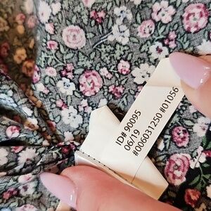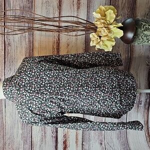 Express Slim, long sleeve black floral, button-up, collared, fitted blouse/shirt. Double adjustable buttons at sleeve ends. Two extra buttons are attached to the care tag. Round tuckable hem.
