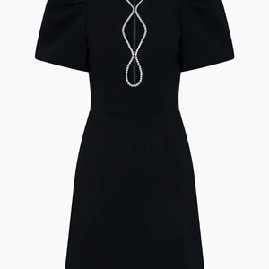 From Neimans website: Estella sheath minidress from Rebecca Vallance features V-neck and bust cut outs decorated with sparking crystals and balloon sleeves to finish the look.